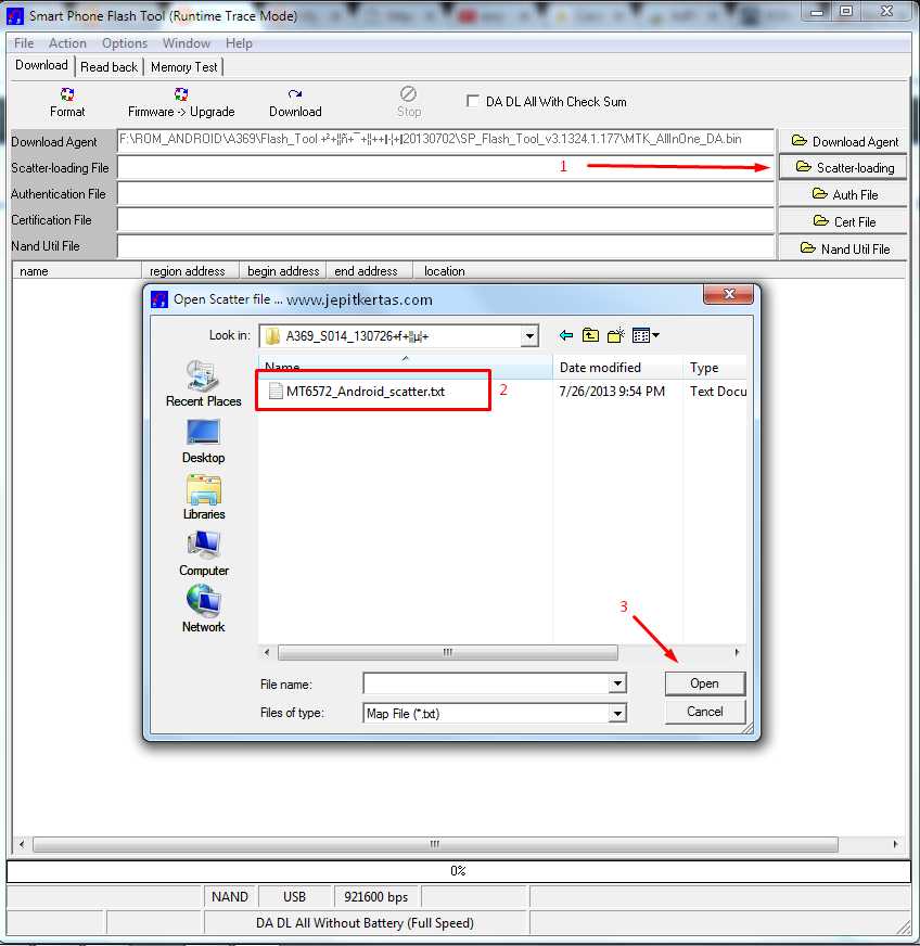 - Pada aplikasi pilihlah “Scatter-loading” dan arahkan ke folder hasil ekstrakkan lalu pilih file yang seperti ini “MT65xx_Android_scatter.txt“.